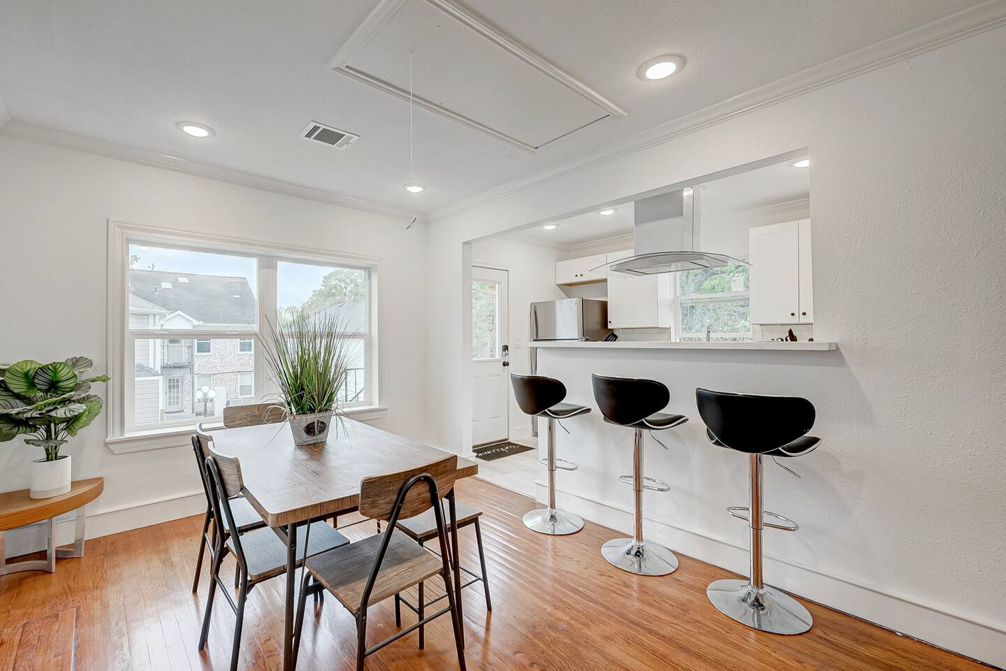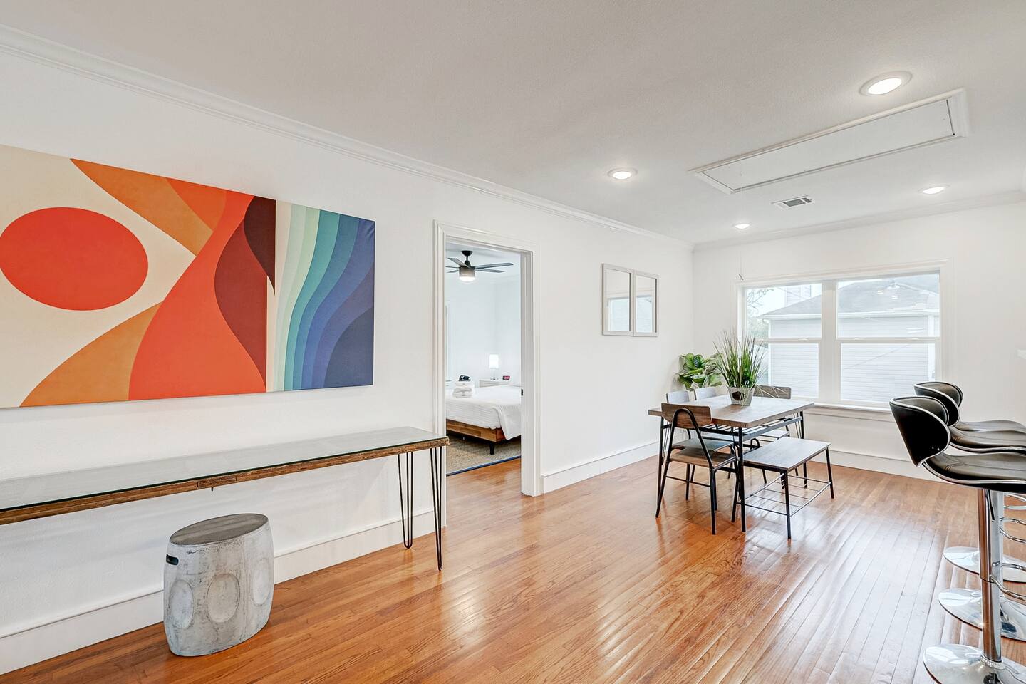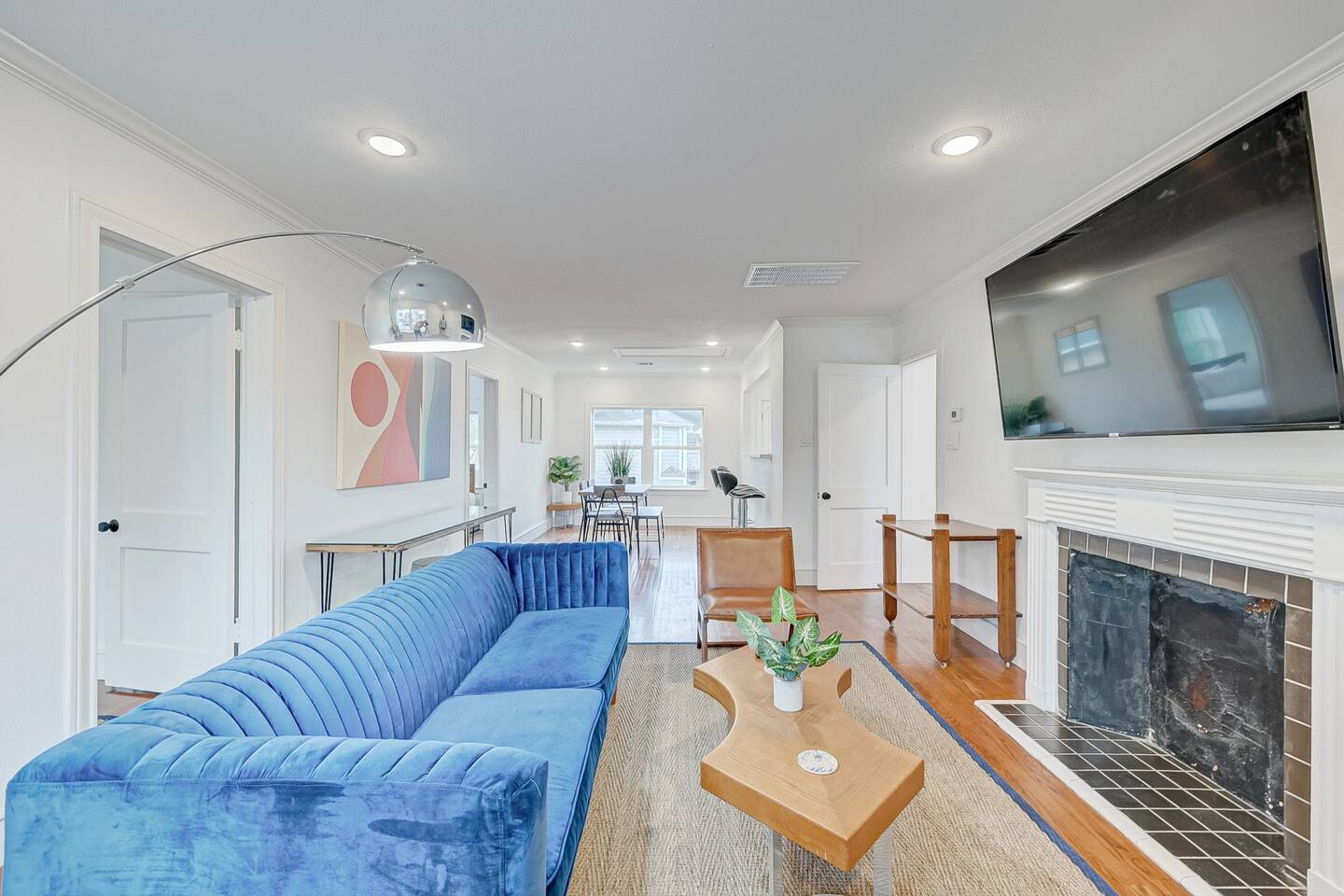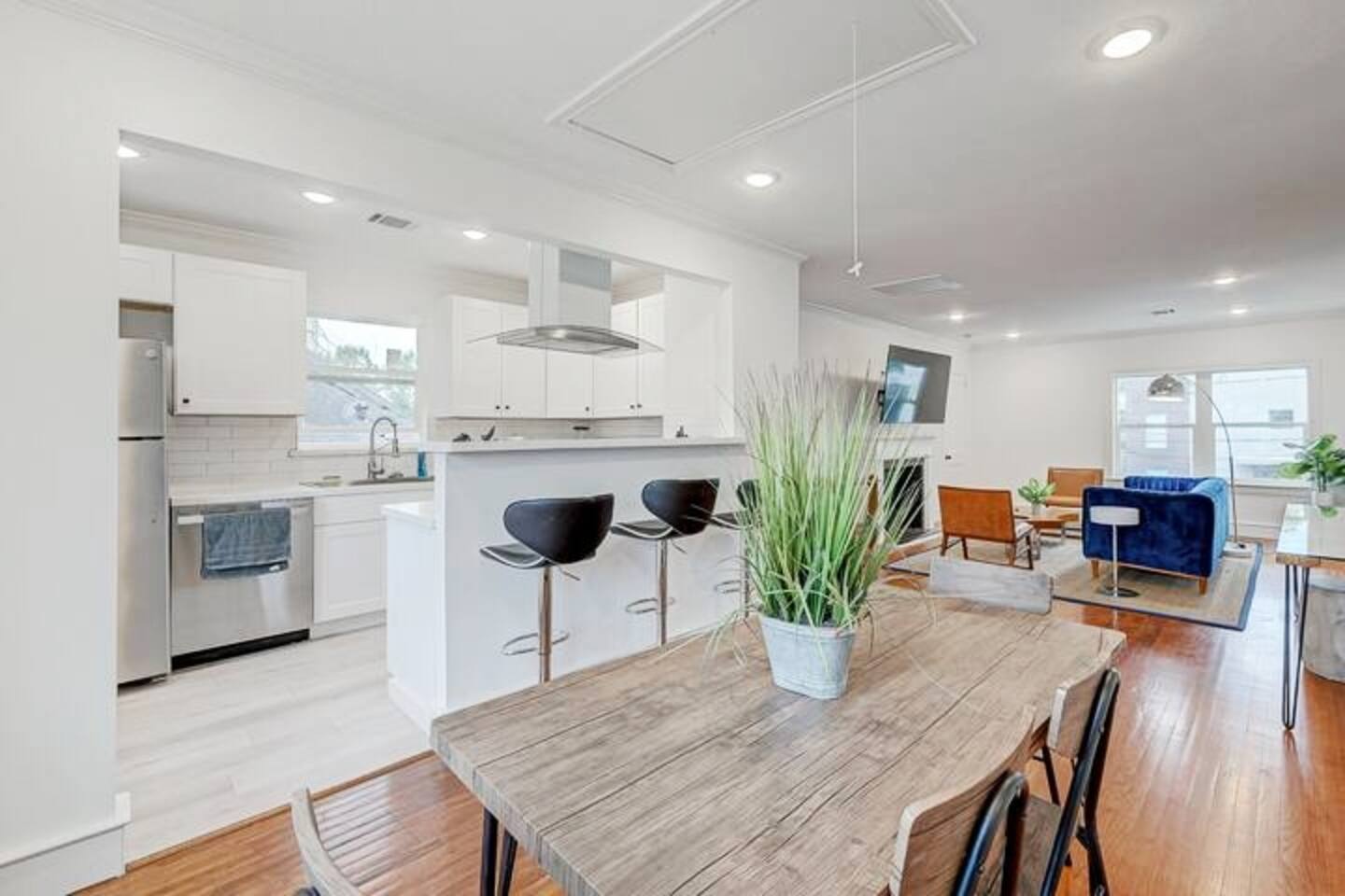 ***We always welcome guests interested in 30+ days reservations*** This newly remodeled ~1,000 sq ft duplex first floor apartment is located in the heart of Houston and offers 2BR & 1BA. We are walking distance from Houston's best restaurants, shops, and sights. The open-concept living and dining room is tastefully decorated with a modern-chic design and features a fireplace and plenty of natural light. The fully-equipped kitchen boasts new appliances, classic white cabinets, and white subway tiles. The bedrooms are equipped with king-sized beds, TVs, and connected to a 3-piece bathroom with newly remodeled vanities and subway tiles. The outdoor area is covered and decorated with hanging lights, making it suitable for any weather. It features patio furniture, a picnic bench, and a ping pong table. Pets are welcome, and the house has gated front and back areas for dogs to play in.