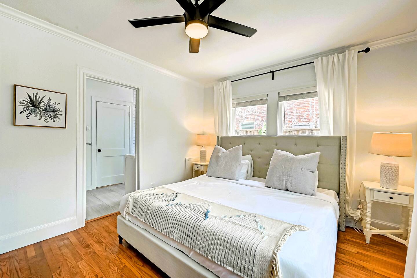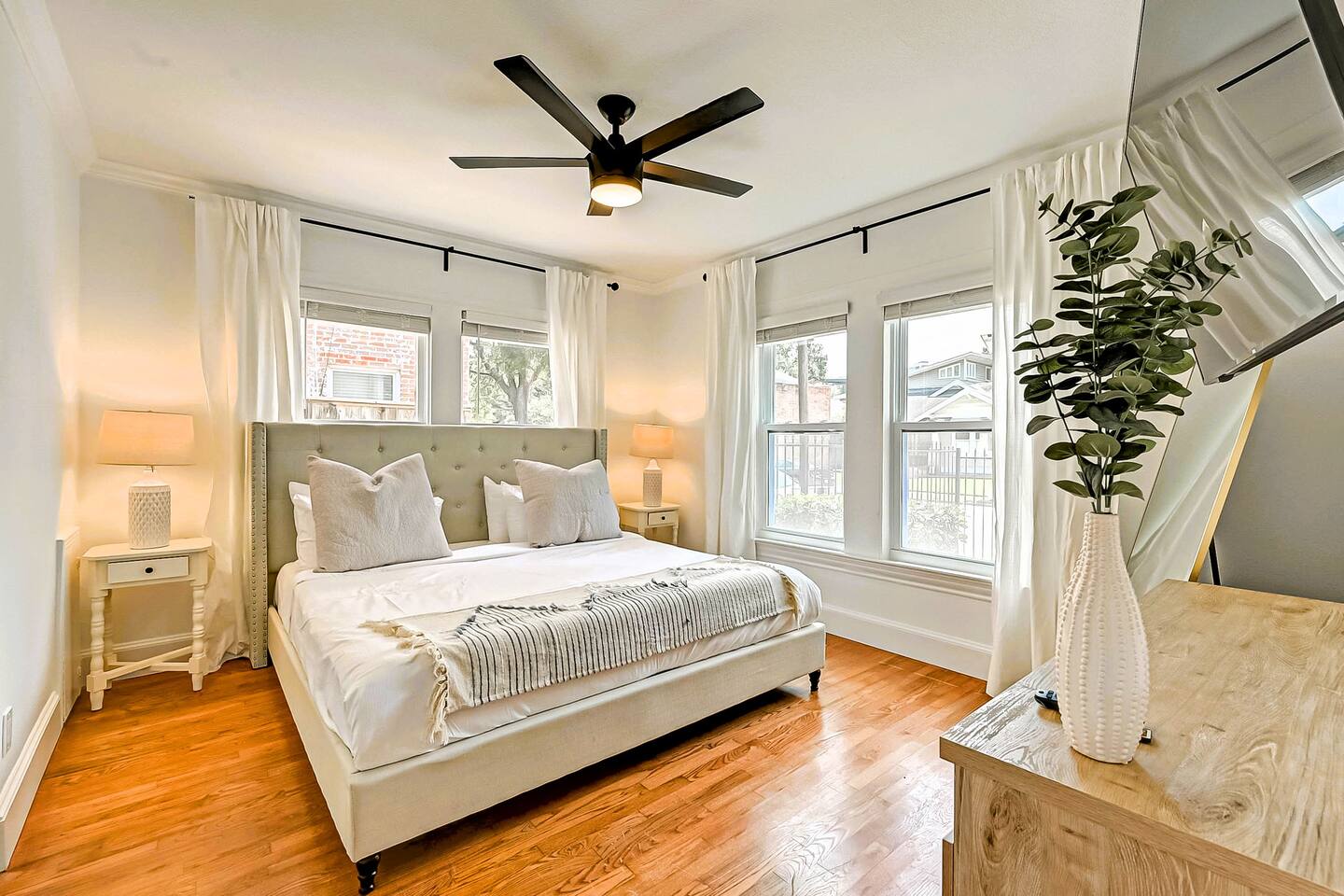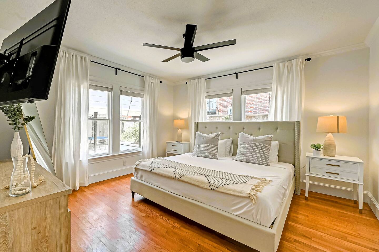 **30+ Day Guests Preferred** Please reach out to schedule a tour! Our home is a newly remodeled 2-bed/1-bath house located conveniently in the heart of Houston. We’re perfect for hosting groups of up to 4. Off-Street Parking for guests. Free and safe for additional vehicles on Fairview Street. Enjoy our tastefully decorated modern-chic open-concept living and dining rooms. With plenty of natural sunlight and a fireplace, this is a bright airy space that’s perfect for all your dining and lounging needs. The kitchen has new stove, oven, microwave, dishwasher, and fridges for all your cooking needs. Designed with classic white cabinets and white subway tiles, our kitchens are clean, bright, and look like they belong on HGTV. Gather with friends and family around the upstairs traditional dining room table or settle around the downstairs farmhouse chic dining area. While you’re here, you’ll sleep like a king. Each bedroom features a king-sized bed, two side tables, two side lamps, an overhead fan, and the luxury of a 65” TCL Internet Ready TV. No need to fight over what to watch. The bedrooms are also connected to 3-piece bathrooms. Newly remodeled with bright white subway tiles and new vanities, you’ll feel as if you’re in a hotel. Last but certainly not least is our outdoor hang out area. It’s perfect for group gatherings. It’s covered and decorated with hanging lights, so it’s suitable for any weather. There’s outdoor patio furniture and a 65” TV for your lounging pleasure. Enjoy an outdoor meal gathered around the picnic bench or the high table. We even have a ping pong table. Your furry friends are also welcome. We believe pets are a part of the family and are happy to host them as well. Our house has gated front and back areas for dogs to play in. We are located in the heart of Houston and are mere blocks away from some of Houston’s best restaurants, shops, and sights. We’d be happy to provide you with recommendations.